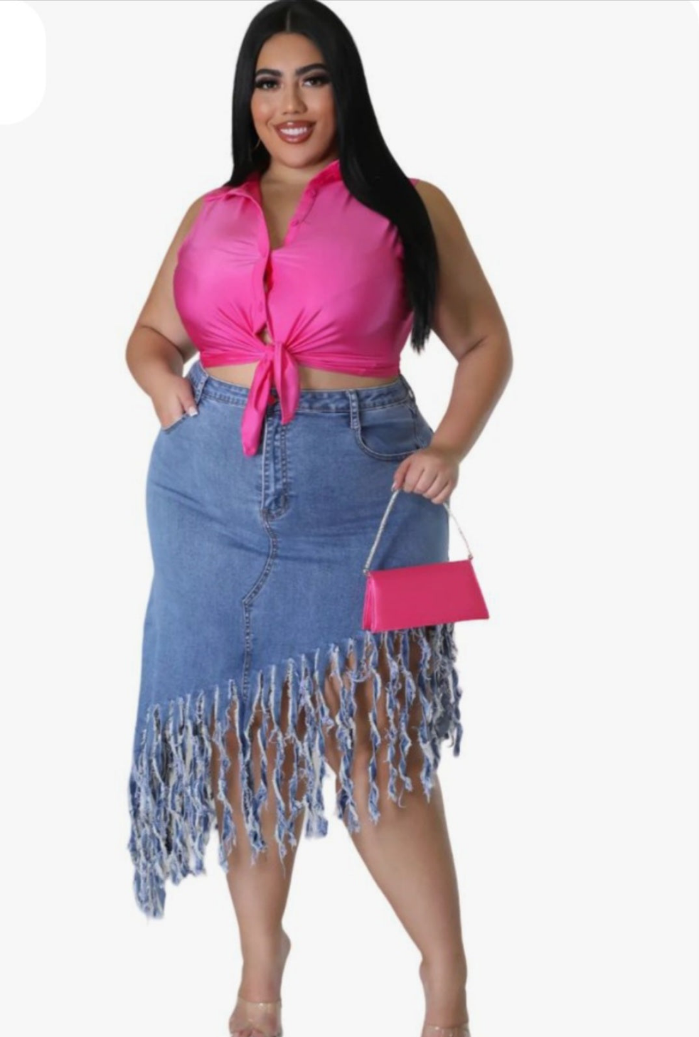DISTRESSED DENIM FRINGE STRETCH SKIRT